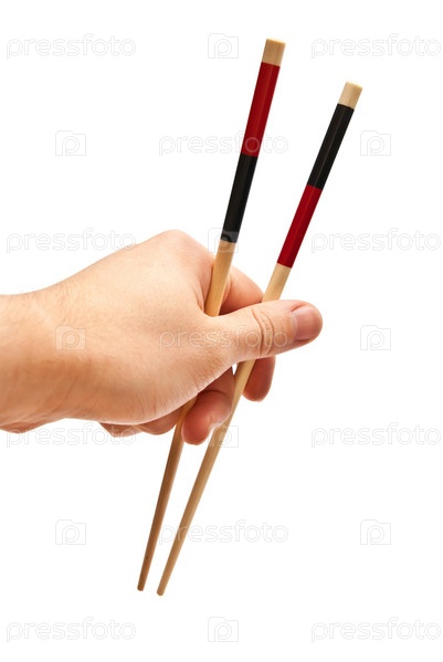 Китайские палочки для еды в мужской руке на белом фоне