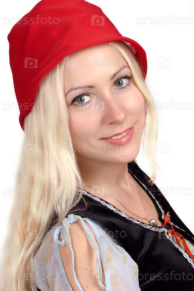 Портрет молодой девушки в костюме красной шапочки на белом фоне
