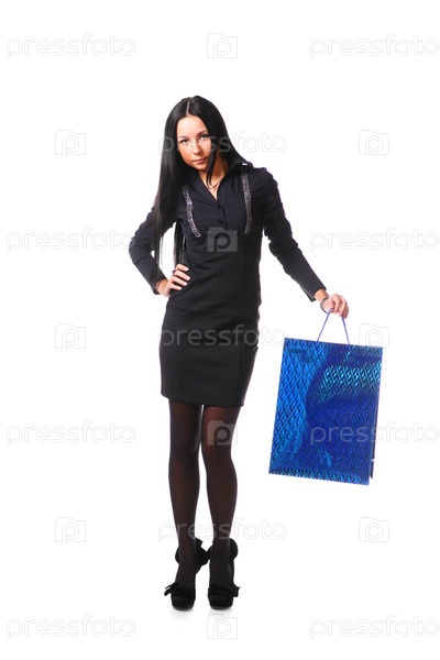 Портрет молодой девушки с пакетом в руке на белом фоне