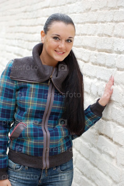 Портрет молодой темноволосой девушки у белой кирпичной стены