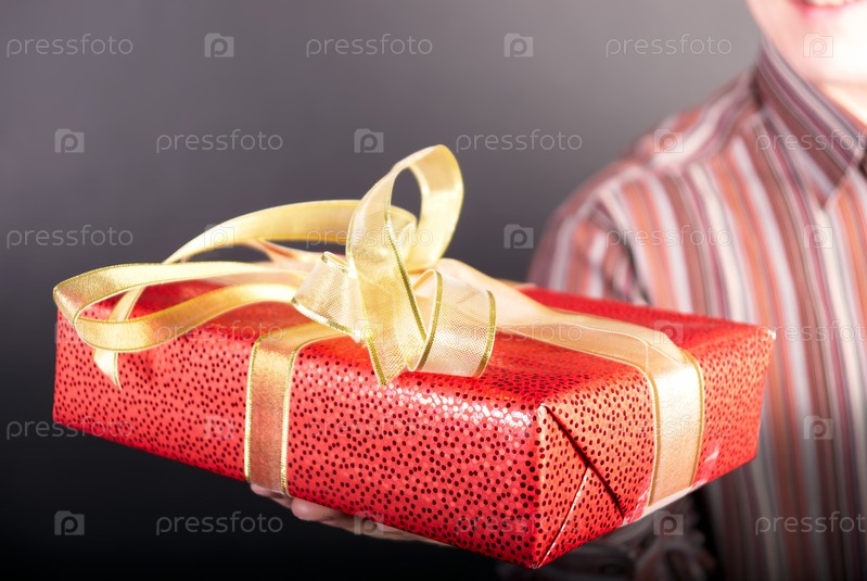 Подарок в красивой упаковке на руке мужчины