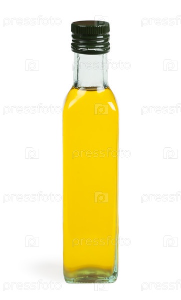 Бутылка с оливковым маслом на белом фоне