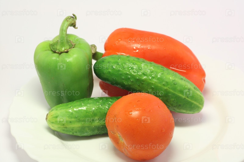 Свежие овощи: два перца, помидор и две огурцы на белой тарелке
