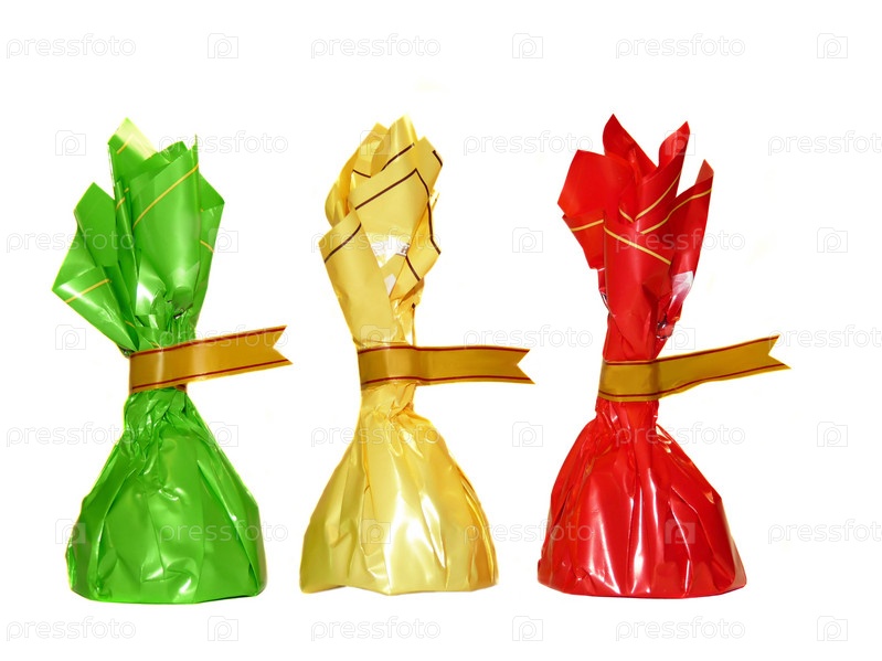 Три конфеты в разноцветных обертках на белом фоне