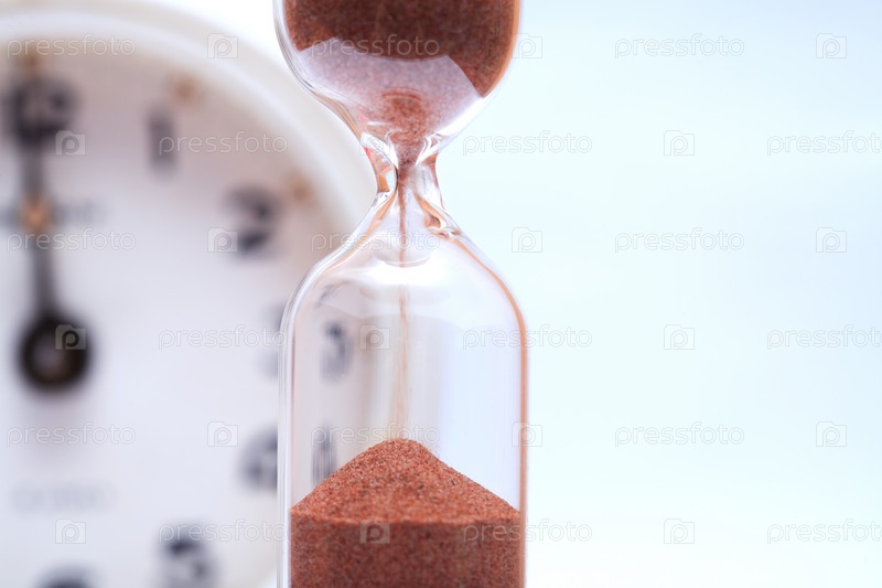 Песочные часы на фоне циферблата крупным планом