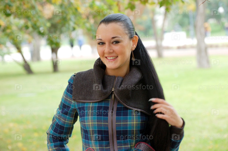 Молодая симпатичная брюнетка в парке осенью