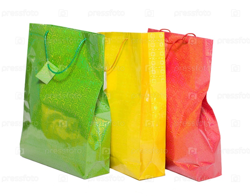 Три пакета с подарками на белом фоне крупным планом
