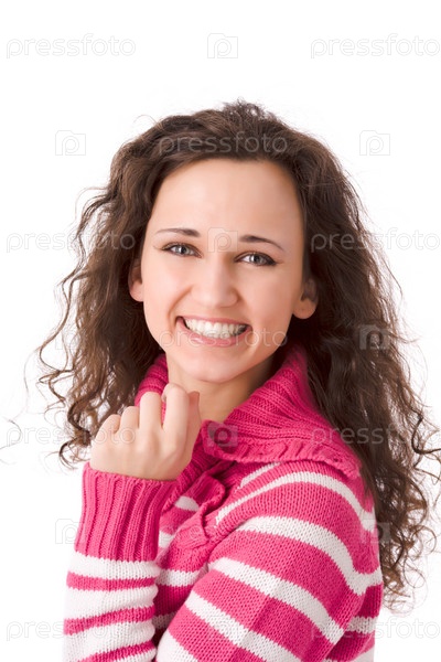 Портрет молодой веселой брюнетки на белом фоне