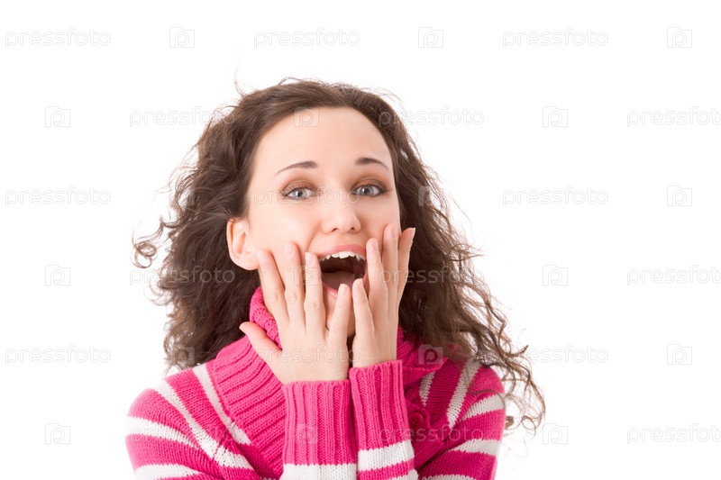 Портрет молодой веселой брюнетки на белом фоне