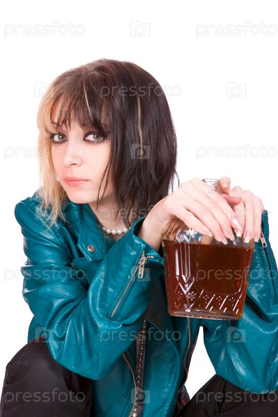 Молодая девушка с бутылкой в руках на белом фоне