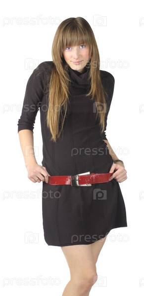 Светловолосая девушка в черном платье с красным поясом, изолированная на белом фоне