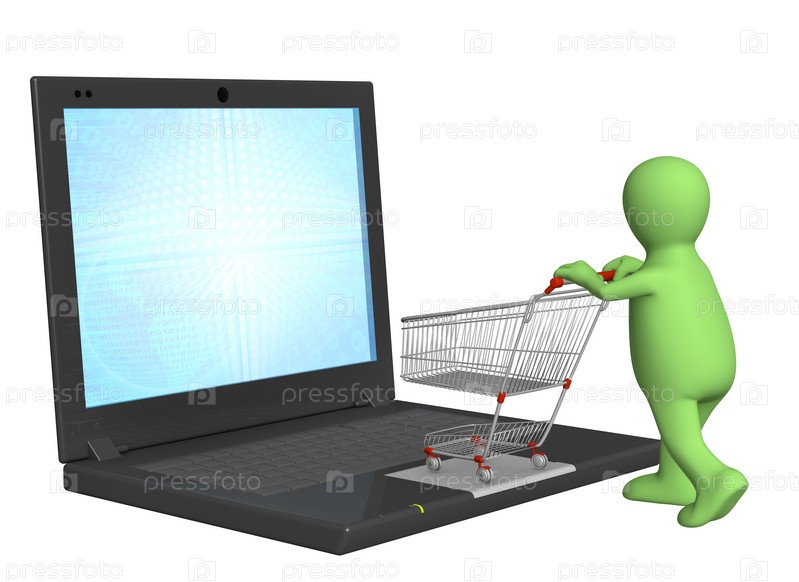 Покупки через Интернет, человечек зеленого цвета с тележкой у ноутбука, изолированный на белом фоне