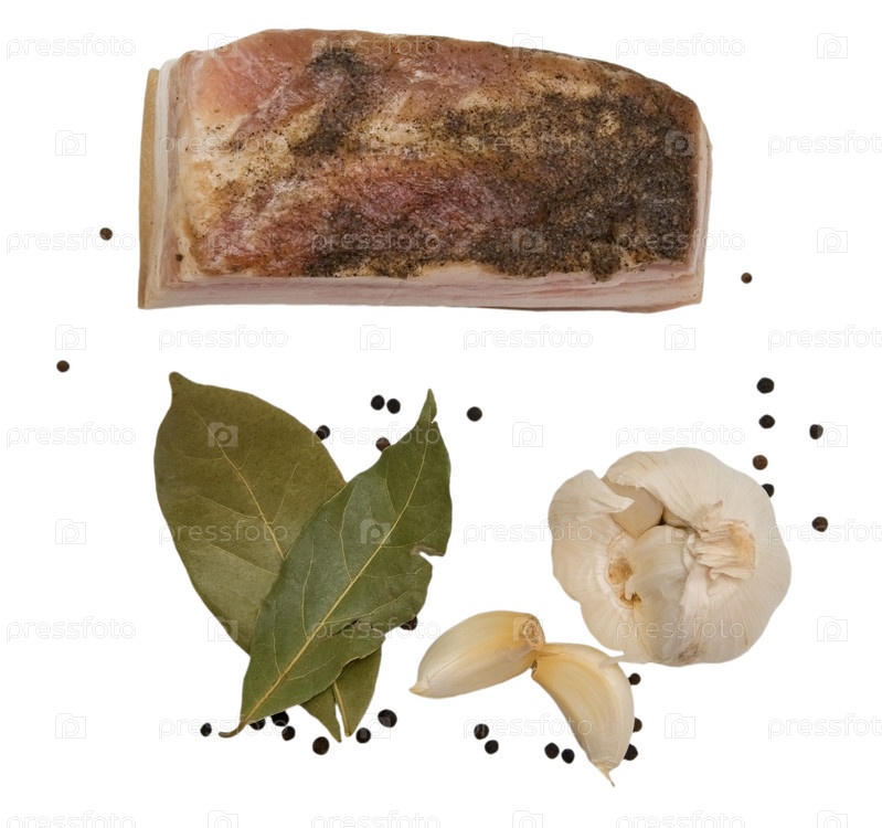 Сало, лавровые листья, черный перец и чеснок