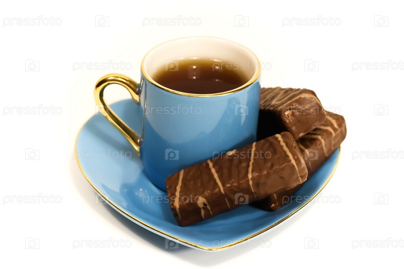 Чашка с чаем и тарелка со сладостями на белом фоне
