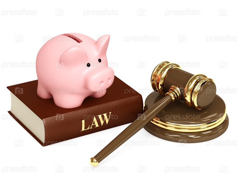 Свинья - копилка, судейский молоток и книга, изолированные на белом фоне