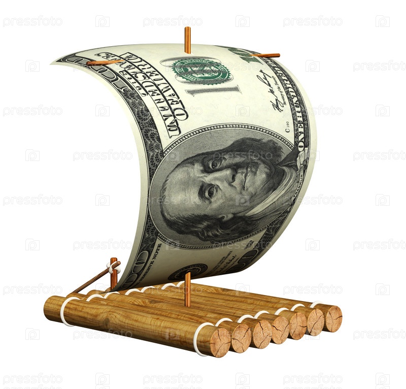 Плот с парусом из долларовой купюры, изолированные на белом фоне