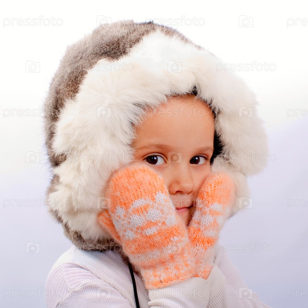 Маленькая девочка в меховой шапке и рукавицах на белом фоне