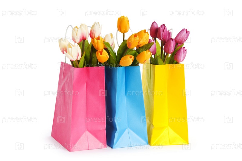 Тюльпаны в ярких бумажных пакетах на белом фоне