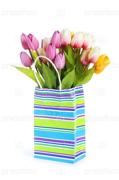 Тюльпаны в ярком бумажном пакете на белом фоне