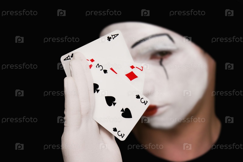 Портрет мима с игральными картами на черном фоне