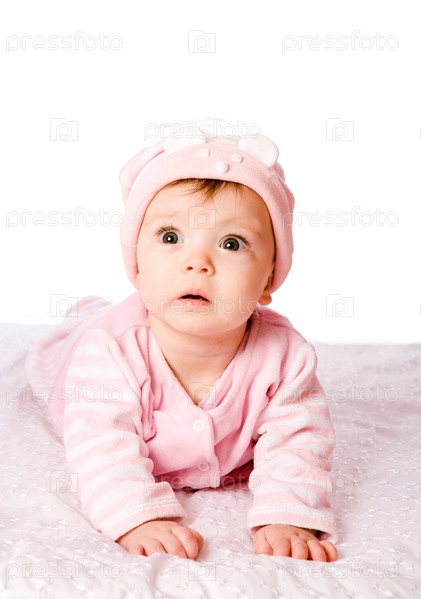 Портрет очаровательного ребенка в розовом костюме на белом фоне
