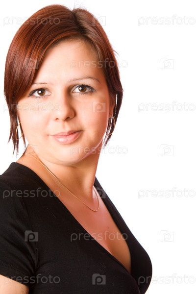 Портрет симпатичной женщины в черном платье на белом фоне