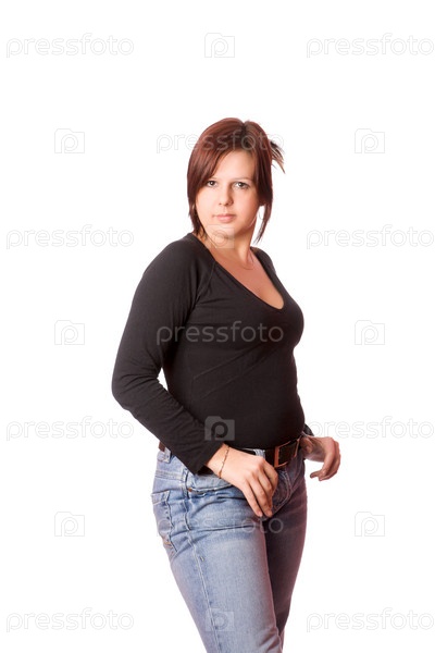 Портрет симпатичной женщины в брюках на белом фоне