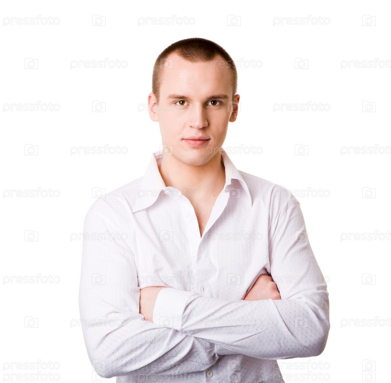 Молодой человек в белой рубашке на белом фоне