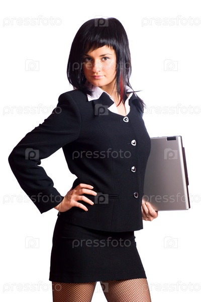 Портрет красивой бизнес-леди с ноутбуком на белом фоне