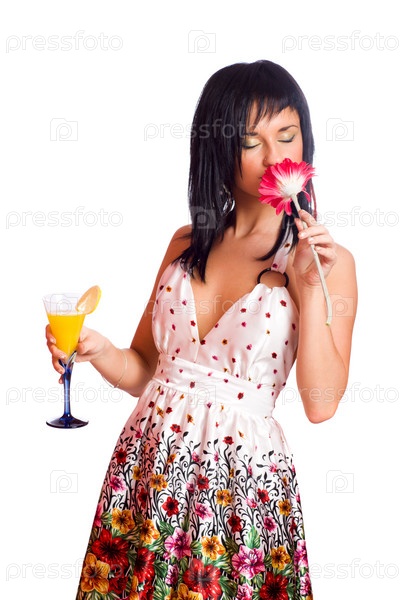 Красивая женщина со стаканом сока и с цветком в руке на белом фоне
