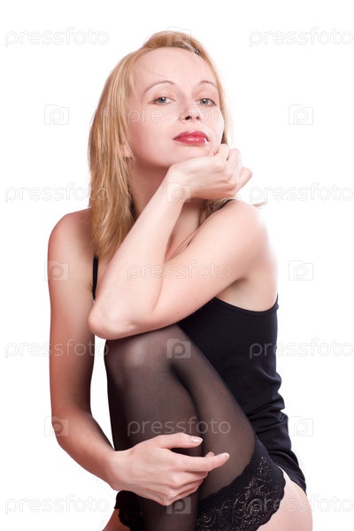 Молодая женщина в чулках на белом фоне
