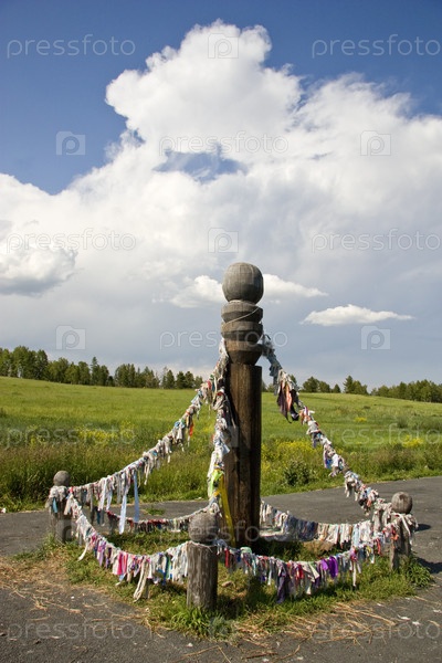Молитвенный столб с цветными лоскутками