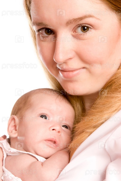 Портрет молодой мамы с младенцем на белом фоне