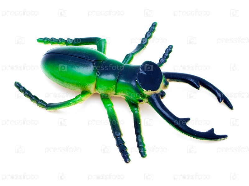 Насекомое животного мира - игрушечный резиновый зеленый жук, изолированный на белом фоне