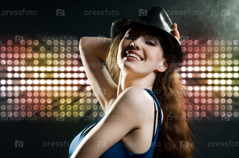 Девушка в дыме, освещенная прожекторами