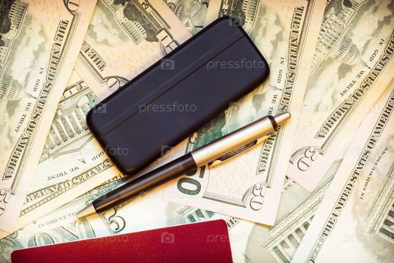 Паспорт, телефон, ручка на долларах