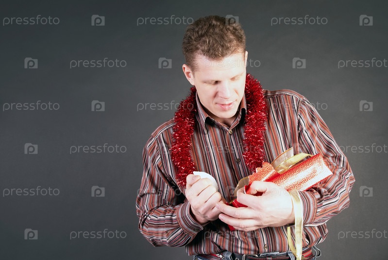 Мужчина снимает оберточную бумагу в подарка