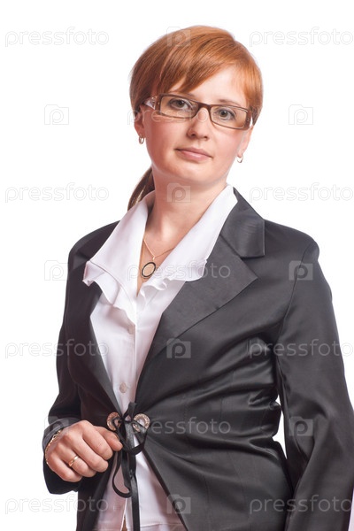 Портрет рыжеволосой женщины в деловом костюме на белом фоне
