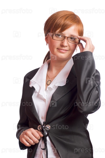 Улыбающаяся женщина в деловом костюме на белом фоне