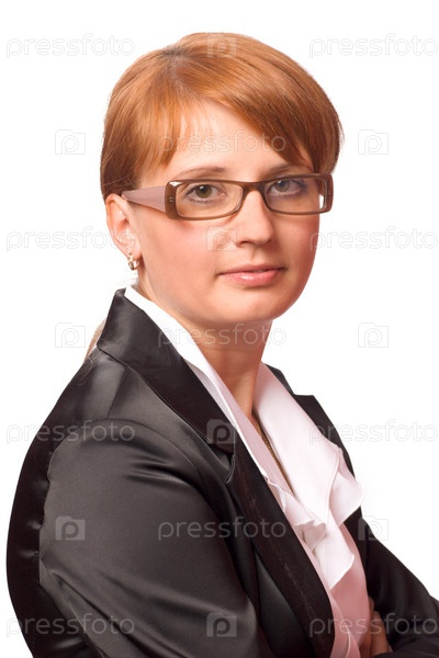 Деловая рыжеволосая женщина в очках на белом фоне
