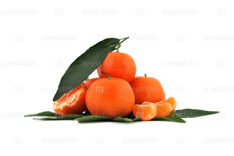 Мандарины с листьями на белом фоне