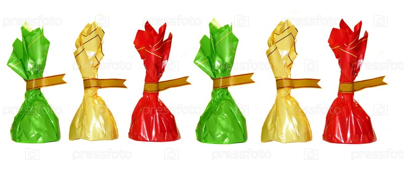 Шоколадные конфеты в красочных обертках на белом фоне