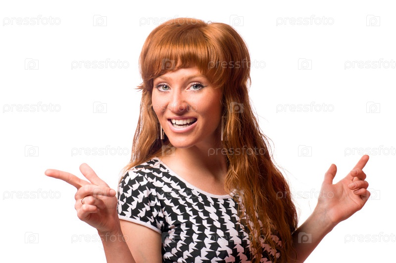 Позитивная рыжеволосая женщина на белом фоне