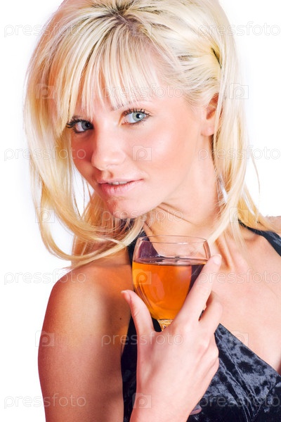 Портрет молодой девушки с бокалом вина в руке на белом фоне