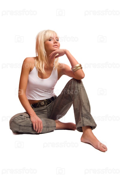 Красивая молодая девушка сидит на белом фоне