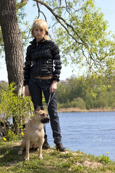 Молодая девушка гуляет в парке с собакой