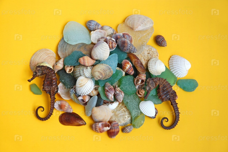 Морские ракушки и стеклянные камни на желтом фоне