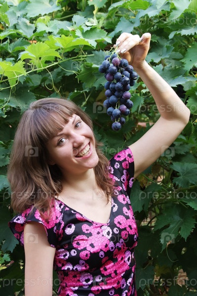 Молодая девушка в саду с гроздью спелого винограда