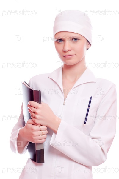 Молодая женщина в медицинском халате и шапочке с папкой документов