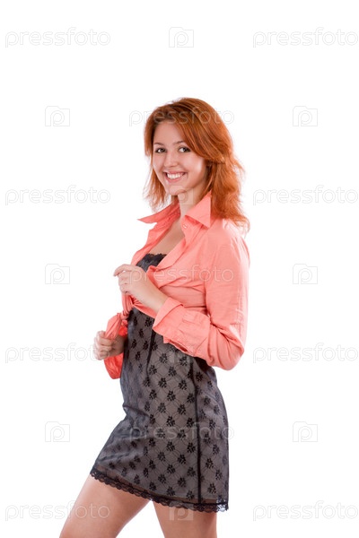 Молодая женщина в коротком платье и розовой рубашке на белом фоне